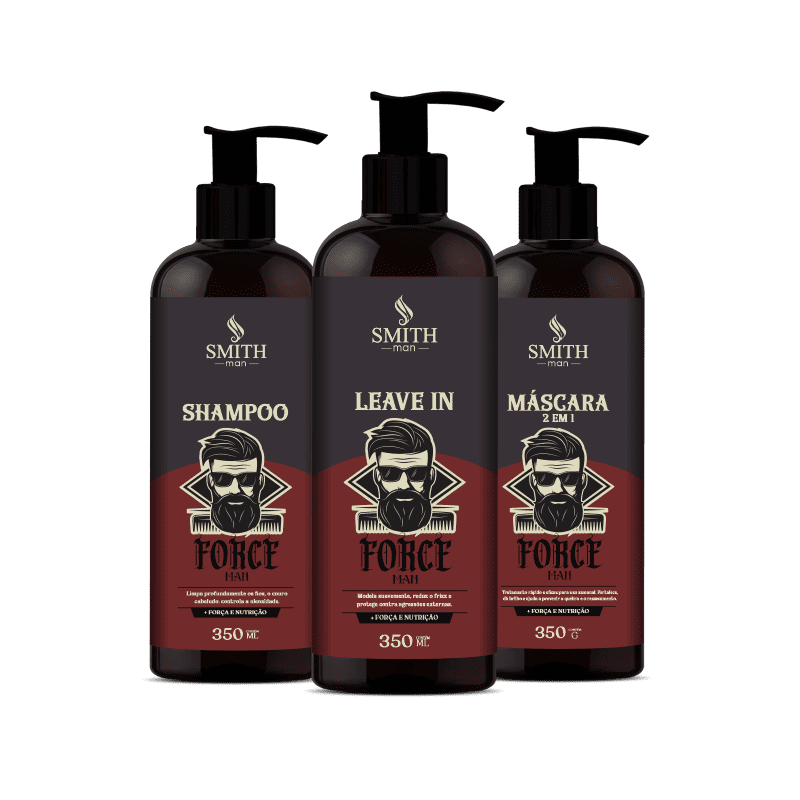 O Shampoo FORCE MAN da SMITH Professional PROMOVE Limpeza eficiente que remove resíduos sem ressecar. Fortalece os fios desde a raiz, proporciona maleabilidade e prepara o cabelo para os tratamentos seguintes. O LEAVE IN FORCE MAN da SMITH Professional É UM Finalizador com textura leve, ideal para todos os tipos de cabelo masculino. Garante proteção térmica, ação nutritiva e efeito disciplinado sem pesar. A MÁSCARA FORCE MAN da SMITH Professional É UM CREME multifuncional que pode ser usada como tratamento intensivo ou condicionador. Nutre profundamente, fortalece a fibra capilar e melhora a textura do cabelo.